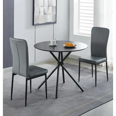 PREMIUM QUALITY CONSTRUCTION | Crafted for everyday use, this table and chairs set 4 includes durable wood effect top and cushioned grey leather seats. The W90 x H75 x D90cm table and 2 chairs in black metal legs, at W42 x H96 x D56cm, offer style and measure. SLEEK & MODERN DESIGN | Featuring a smooth black wooden effect surface and robust metal legs, this small round dining table for 2 elevates any space. The small table and chairs set is perfect for modern homes that value function and design. VERSATILE FUNCTIONALITY | The table and chairs set 2 includes a comfy dining chairs set of 2 in light grey faux leather padded seats and supportive backs. Ideal for tight spaces, it blends contemporary style with compact practicality. SUPERIOR QUALITY COMMITMENT | Experience timeless durability with this round table 2 chairs set, designed as a 2 seater dining table and chairs. Each piece is crafted to the highest safety standards and comes with a free one-year quality guarantee. ASSEMBLY MADE EASY | Enjoy hassle-free assembly with a small table and chairs for 2 that comes with easy instructions. This dining table and chairs set fits perfectly in compact dining room sets, adding modern charm without sacrificing function.