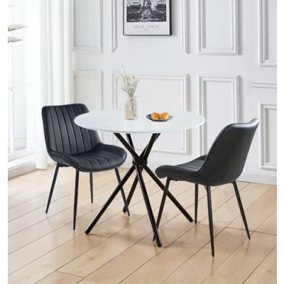 PREMIUM QUALITY CONSTRUCTION | Built for daily use, this small dining table and 2 chairs features a H 75 x W 90 x D 90 cm round table with strong legs, and two H 84 x W 52 x D 60cm black bonded leather chairs for added comfort and durability. SLEEK & MODERN DESIGN | This two seater table and chairs combine elegance and simplicity with a marble effect top and bold black legs. The round table and 2 chairs add a sophisticated focal point to kitchens, cafés, or compact spaces. VERSATILE FUNCTIONALITY | Perfect for modern homes, the small round table and chairs adapt effortlessly to small dining areas or open-plan spaces. The sleek build of the round dining table with chairs also works well in cafés, offices, or flats. SUPERIOR QUALITY COMMITMENT | Backed by a one-year quality guarantee, this small round dining table and 2 chairs reflects Hallowood Furniture’s dedication to quality. Every piece is made to meet the highest standards for safety and durability. ASSEMBLY MADE EASY | This marble dining table and chair set comes with high-quality easy to assemble metal legs, all packages include instructions manuals. A stylish, low-maintenance choice for any modern space.