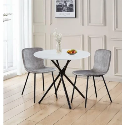 ManoManoGeneral description Infuse modern sophistication into your dining space with our expansive round table set, a harmonious marriage of style and comfort. The 90 cm round table boasts a sleek white marble effect top that exudes elegance and versatility, complemented by sturdy black metal legs for stability and contemporary charm. Accompanying this captivating centerpiece are the ergonomic chairs with leather effect, designed for both style and comfort, featuring inviting seating and wooden legs that effortlessly complement the table's sleek design. The chairs' chic grey upholstery against the white marble effect tabletop epitomizes a modern appeal that ensures a comfortable and delightful dining experience. From the chic tabletop to the inviting design of the chairs, this set offers a perfect fusion of contemporary aesthetics and comfort, creating an inviting setting for enjoyable meals and gatherings in your home. Technical specifications Table dimensions: H 75 x W 90 x D 90 cm Chair