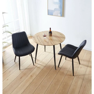 General description Introduce modern elegance to your dining space with our compact round table set, designed to elevate any area with style and functionality. The 90 cm round table boasts a light oak effect top that exudes a natural charm, coupled with sleek black metal legs for a contemporary edge and sturdy support. Accompanying this chic centerpiece are black bonded leather chairs, offering both comfort and sophistication with their sleek design and durable construction. These chairs effortlessly complement the table's modern aesthetic, providing a sleek contrast against the light oak finish. From the compact yet charming table to the stylish allure of the chairs, this set promises a perfect harmony of contemporary design and comfort, creating an inviting space for intimate dining experiences and gatherings in your home. Technical specifications Table dimensions: H 75 x W 90 x D 90 cm Chair dimensions: H 84 x W 52 x D 60 cm Material: Metal and MDF Finish: Laminated Colour: Black
