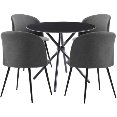 PREMIUM QUALITY CONSTRUCTION | This elegant set boasts a round black wood-effect round dining table (H75 x W90 x D90cm) and four matching grey fabric curved-back chairs (H76 x W54 x D52cm), all crafted with strength and comfort in mind. SLEEK & MODERN DESIGN | Designed for modern living, the round table and chairs set 4 combine streamlined shapes with bold black finishes. The round dining table and chairs set 4 offer a sophisticated aesthetic perfect for any dining room. VERSATILE FUNCTIONALITY | Whether you're enjoying a quiet breakfast or entertaining friends, this small table and chairs set delivers comfort and practicality. The space-saving table and 4 chairs make it ideal for versatile use. SUPERIOR QUALITY COMMITMENT | Quality you can count on—crafted for daily use, this round table and 4 chairs is built with durable materials and smart design. A dependable round dining table for 4 backed by a free 1-year quality guarantee. ASSEMBLY MADE EASY | Assembly of the small round dining table and chairs is simple and hassle-free, thanks to the included step-by-step guide. With minimal effort, the round dining table and chairs can be built quickly and securely.