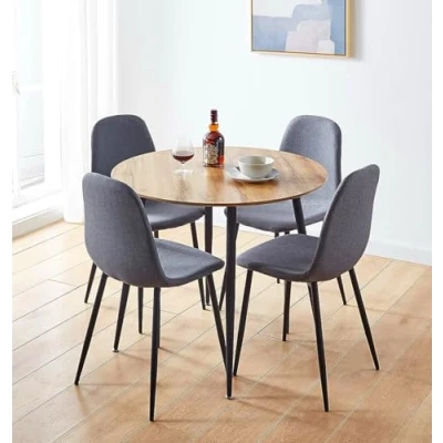PREMIUM QUALITY CONSTRUCTION | Crafted from a premium MDF top round dining table, and 4 fabric chairs, both supported by metal legs, this set offers a long-lasting build. Dimensions are 90D x 90W x 75Hcm for table, and 54D x 45W x 86Hcm for chairs. SLEEK & MODERN DESIGN | This brown oak effect top kitchen table and chairs set 4 has an ergonomic design, in grey fabric cushion. With matching sturdy powder-coated black metal legs, this stylish set offers a sleek industrial vibe for modern setup. VERSATILE FUNCTIONALITY | Designed for small spaces, this round table and chairs set 4 is ideal for breakfast corners, apartments, offices, or cafes. Its multifunctional use makes it suitable for casual dining, or even cosy client meetings. SUPERIOR QUALITY COMMITMENT | Backed by a one-year quality guarantee, this round dining table and chairs set 4 reflects Hallowood Furniture’s dedication to quality. Every piece is made to meet the highest standards for safety and durability. ASSEMBLY MADE EASY | This small table and chairs for 4 comes with high-quality easy to assemble metal legs. All packages include instructions manuals. A stylish, low-maintenance choice for any modern space.