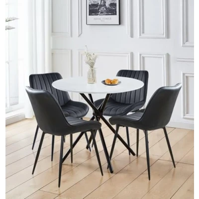 Hallowood Furniture Cullompton Small Round Dining Table and Chairs Set 4, White Marble Effect Kitchen with Black Bonded Leather Chairs, Room for Home Cafe