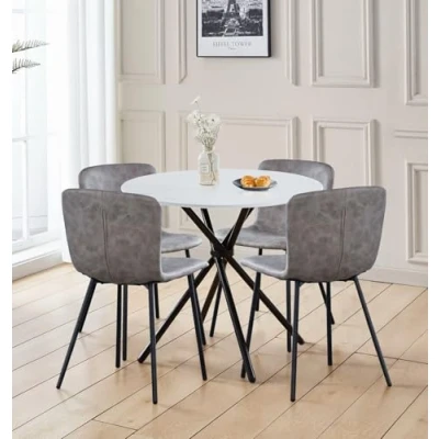 PREMIUM QUALITY CONSTRUCTION | A 4 seater dining table and chairs featuring a H75 x W90 X D90cm white marble effect table. The round dining table with chairs include curved-back taupe leather chairs H76.5 x W51 x D44cm and black metal bases. SLEEK & MODERN DESIGN | Make a statement with this white round dining table featuring a marble-effect top and bold black metal legs. A sleek centrepiece in any space, part of a stylish round table and chairs set 4 built for modern dining. VERSATILE FUNCTIONALITY | Dine in comfort and style with a round table with 4 chairs in cushioned taupe seats and sturdy frames. A sleek dining table and chairs set 4 perfect for modern kitchens, small apartments, or casual dining spaces. SUPERIOR QUALITY COMMITMENT | Experience lasting quality with a small dining table and chairs set 4 featuring a sleek white round table and chairs. It comes with a one-year quality guarantee, for both elegance and peace of mind. ASSEMBLY MADE EASY | Enjoy quick and easy setup with a space saving table and chairs designed for compact living. The small round table and chairs for 4 combine sturdy black legs and modern design for a perfect kitchen or breakfast nook upgrade.