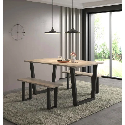 ManoManoThis stylish and ultra-modern dining table features distinctive black legs and an appealing light oak effect table-top. The combined look is decidedly contemporary and fresh. This dining table will take centre stage in any diner/kitchen or dining room. The dining table is spacious and provides enough room for the whole family. Its clean minimalist design means that if you want to use the table in other ways, such as a home office desk or a gaming table, this piece fits the bill perfectly. The light oak tones of the table are a classic and timeless favourite. It's a versatile look that can be blended with virtually any interior design and décor choice in the home. It's rare that you find a piece that is as practical and versatile as it is stylish and eye-catching, this beautiful dining table certainly ticks all the boxes. The two matching benches have the same design and look as the table. The trunky metal base provides a study support of the seat as well as the attritive look Features