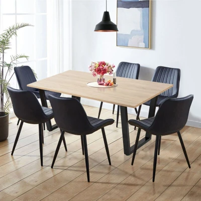 PREMIUM QUALITY CONSTRUCTION | This 6 seater dining table with chairs features a light oak MDF top, U-shaped metal legs, and black leather seats for modern dining room sets. Its table measures 150W x 77H x 80Dcm and each chair is 84H x 60D x 52Wcm. SLEEK & MODERN DESIGN | Experience comfort with a dining chairs set of 6 featuring plush faux leather dining seat 6 upholstery. Perfectly designed for both style and durability, these chairs bring a luxurious yet practical touch to any dining room. VERSATILE FUNCTIONALITY | An oak dining table with a 150cm table top offers perfect size and style for any space. This kitchen table and chairs set 6 offers modern design and fits your style, while elevating your dining experience. SUPERIOR QUALITY COMMITMENT | Upgrade your dinner set with a table and chairs set 6 that combines a durable dining table with chairs in plush black seats. Designed for everyday use and backed by a one-year quality guarantee. ASSEMBLY MADE EASY | Effortless to set up and built to last, this dining table and chairs set features a laminated oak top dining table and sleek bonded leather chairs, perfect for adding timeless style with minimal assembly required.