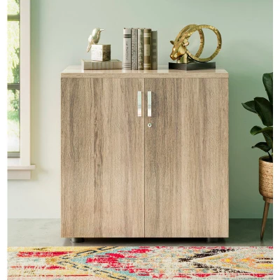 General description This stylish and sleek small cupboard is the ideal storage solution for the home office. It provides plenty of storage space while keeping everything neat, tidy, and organized. With two doors and a lockable feature, you can securely store your items out of sight. The compact design allows it to fit easily in smaller rooms, yet it offers ample storage capacity. The cupboard is enhanced with two stylish metal handles and sits on attractive black metallic feet. Technical specifications Material: MFC board and metal legs Finish: Laminated Colour: Brown Height: 82 cm Width: 80 cm Length: 40 cm Assembly: Required Features: Thick shelves, sturdy and durable