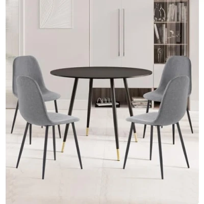 ManoManoGeneral description A harmonious fusion of modern elegance and practicality that will elevate your dining experience. This versatile ensemble features a round dining table with a sleek veneer and striking black finish, exuding sophistication and charm. Its compact yet spacious design allows it to seamlessly integrate into any kitchen or dining room, regardless of its size. The table's captivating black legs, adorned with a touch of golden decoration, add a touch of opulence that is sure to captivate your guests. Paired with this stunning table is the on-trend Grey Fabric Chair with Black Legs, the epitome of contemporary style. Its slim profile and subtle curved design make it an ideal choice for a dining chair, home office chair, or casual seating option. The chair is elegantly upholstered in an ultra-modern shade of grey, a versatile color that effortlessly complements any interior decor. The sturdy metal legs in black provide the perfect contrast, enhancing both the chair's