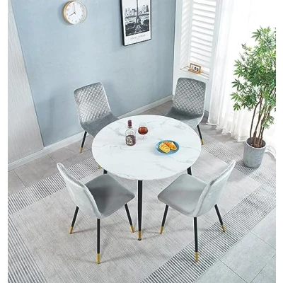 PREMIUM QUALITY CONSTRUCTION | Crafted from a premium wood top round dining table with 4 fabric chairs, both supported by metal legs, this set offers a sturdy build. Dimensions are 100D x 100W x 75Hcm for table, and 54D x 44W x 88Hcm for chairs. SLEEK & MODERN DESIGN | This marble effect 18mm thick top small dining table and chairs set 4 in grey velvet cushion. With matching sturdy black metal legs with gold accents, this stunning set offers a sleek industrial vibe for modern interiors. VERSATILE FUNCTIONALITY | Designed for small spaces, this kitchen table and chairs set 4 is ideal for breakfast corners, apartments, offices, or cafes. Its multifunctional use makes it suitable for casual dining, or even cosy client meetings. EFFORTLESS COMFORT & STABILITY | With ergonomic backrests and soft velvet seats, this chair delivers comfort and support. The round table and chairs set 4 includes a practical adjustable table feet to maintain stability on uneven flooring. ASSEMBLY MADE EASY | This round dining table and chairs set 4 comes with high-quality easy to assemble metal legs. All packages include instructions manuals. This table and 4 chairs set is a stylish, low-maintenance choice for any modern space.