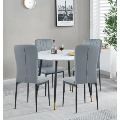 Hallowood Furniture Finley Small Round Dining Table and Chairs Set 4, White Marble Effect Grey Faux Leather Chairs, Modern Kitchen for Home, Office Café