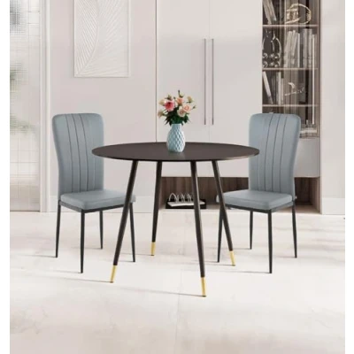 ManoManoGeneral description A harmonious fusion of modern elegance and practicality that will elevate your dining experience. This versatile ensemble features a round dining table with a sleek veneer and striking black finish, exuding sophistication and charm. Its compact yet spacious design allows it to seamlessly integrate into any kitchen or dining room, regardless of its size. The table's captivating black legs, adorned with a touch of golden decoration, add a touch of opulence that is sure to captivate your guests. Paired with this stunning table are on-trend light grey chairs, the epitome of contemporary style. Their slim profile makes them an ideal choice for a dining chair, home office chair, or casual seating option. Technical specifications Material: Metal and MFC Board Finish: Laminated Colour: Black Height: 75 cm Width: 100 cm Length: 100 cm Other information Assembly: Assembly Required The chair is elegantly upholstered in an ultra-modern shade of grey, a versatile color that