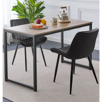 PREMIUM QUALITY CONSTRUCTION | This small dining table and 2 chairs features a smooth MDF table top, sturdy black powder coated U-shaped metal legs, and black faux leather seats. Measures: H74xW120xD60cm (Table) and H84xW52xD60cm (Chairs). SLEEK & MODERN DESIGN | Transform your dining area with a sleek rectangle dining table that blends minimalist and modern edge. This dining table and chairs set 2 is perfect for compact spaces, offering clean lines and a contemporary industrial look. VERSATILE FUNCTIONALITY | Redefine your space with a 2 seater dining table and chairs set made for comfort. Featuring a rectangle table and 2 chairs in black leather and black legs, it's a versatile addition to any dining room, or compact setup. SUPERIOR QUALITY COMMITMENT | Invest in style and durability with a small table and chairs for 2 made for real life. Each table and chairs set is backed by a 1-year quality guarantee, offering timeless design with lasting performance in any space. EASY MAINTENANCE & ASSEMBLY | Spend less time on setup and cleaning with this kitchen table and 2 chairs set designed for busy lives. The table and chairs set 2 boasts an easy-to-maintain surface, plus clear instructions for stress-free assembly.