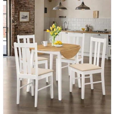 Hallowood Furniture Ledbury Round Dining Table and Chairs Set 4, Small Drop Leaf Oak Top Folding White in Cream Fabric Padded Seats, Space Saving for Home or Cafe Use
