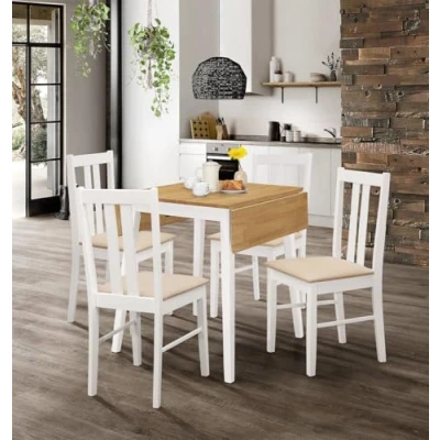 PREMIUM QUALITY SOLID WOOD | Made from durable 100% rubberwood, this H74 x W61-97 x D76cm small dining table and chairs set 4 at H89 x W41 x D46cm, this set includes a space-saving rectangle drop leaf table and 4 chairs with cushioned seats. SLEEK & MODERN DESIGN | Folding dining table combined with small dining table and chairs with white legs contemporary style offering a sleek, space-efficient setup in white and beige finishes for compact kitchens and practical daily use. VERSATILE FUNCTIONALITY | Foldable dining table included in table and chairs set 4 offers versatile functionality with a space-saving drop leaf and convenient under-table chair storage, designed for cosy kitchens and modern living spaces. SUPERIOR QUALITY COMMITMENT | Small dining table and dining chairs set of 4 featuring a foldable drop leaf, perfect for space-saving dining in compact kitchens. Durable, stylish, and backed by a one-year quality guarantee for everyday use. EASY MAINTENANCE & ASSEMBLY | White table and chairs set 4 integrated with a drop leaf table and chairs set 4 offers quick assembly and effortless care, making it a durable and comfortable choice especially for everyday small dining areas.