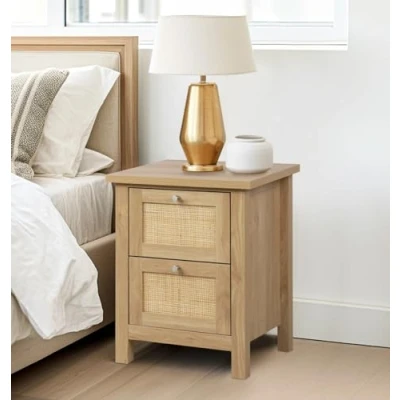 ManoManoGeneral description Elevate your bedroom decor with our Oak-effect Bedside Table, a fusion of modern aesthetics and timeless craftsmanship. This rattan nightstand is expertly crafted from natural rattan, high-quality MDF board, and sturdy legs that provide exceptional load-bearing capacity and stability. Boasting two intricately designed rattan-decorated drawers, this bedside table strikes a harmonious balance between modern elegance and classic charm. The incorporation of natural rattan adds a cool and bohemian vibe to your decor, while its clean lines and natural tones seamlessly blend with any interior style. Versatile in its functionality, this end table serves as an ideal nightstand or bedside companion in your bedroom and can effortlessly transition to become a stylish sofa side table or accent piece in your living room. Whether you have a spacious room or limited space, this bedside table caters to your diverse needs, making it a versatile and chic addition to both large and