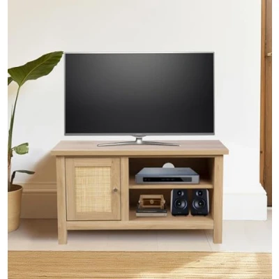 Hallowood Furniture Newquay Oak Effect Small TV Stand with Rattan Front, Wooden Cabinet, Cabinet Storage, for Living Room & Bedroom