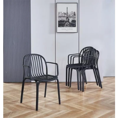 ManoManoGeneral description Elevate your seating options with our durable plastic chairs featuring armrests, tailored for garden, patio, kitchen, or dining use. With a sturdy construction, these chairs boast a minimalist design with a sleek curved profile, adding a touch of modern elegance to any space. Crafted to withstand outdoor elements, they offer both durability and versatility, making them suitable for various environments. Despite their robust build, these chairs remain lightweight, allowing for easy transportation and rearrangement as needed. Whether lounging in the garden, enjoying a meal on the patio, or adding extra seating in the kitchen or dining area, these chairs provide both comfort and style. Technical specifications Height: 81.5 cm Width: 55.5 cm Depth: 59 cm Material: Plastic Colour: Black Other information Features black plastic seat Stackable design Slim profile Assembly: Fully assembled UV stabilizer treatment for outdoor protection