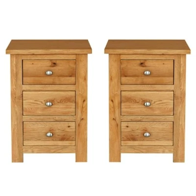 ManoManoGeneral description This solid oak bedside table set is the perfect addition to any bedroom, featuring three drawers and a sturdy top surface. The Waverly Oak 3 Drawer Bedside Table is suitable for holding a lamp, books, and personal items, alongside linen, clothing, and paperwork. This unit may also be used in other rooms as an occasional table and chest of drawers. Each drawer is crafted from solid oak, providing a sturdy and durable build, and is finished with a brushed stainless steel handle for easy access to your belongings. The wood is coated in a natural lacquer for a gloss finish that protects the wood and enhances its natural patterns and coloring. The light oak bedside table works perfectly in rooms featuring other Waverly Oak Collection pieces and complements rooms decorated in light, neutral, or pastel colors. This set comes with two tables, ideal for bathrooms, hallways, dining rooms, and bedrooms. Technical specifications Material: Solid oak frame with real oak veneer