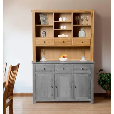 PREMIUM QUALITY SOLID OAK WOOD | Crafted from solid oak wood, this dining room cabinet wooden piece boasts a durable lacquered finish. Our ready assembled sideboard top provides essential storage with dimensions of W128 x H105 x D36cm. SLEEK & MODERN DESIGN | Elevate your living room with our sleek, modern sideboard top. Featuring 3 drawers and open shelves, with lacquer finish and stainless steel knobs. Perfect as large display cabinets/storage units for living room décor. VERSATILE FUNCTIONALITY | A perfect blend of style and functionality, this top sideboard unit features adjustable shelving and 3 drawers. As an excellent storage cabinet for living room spaces, it keeps your essentials organized and within reach. SUPERIOR QUALITY COMMITMENT | Backed by a 3-year quality guarantee, this sideboard storage cabinet top delivers peace of mind with its sturdy build and timeless design. A practical and attractive storage cabinet that fits effortlessly into any room. EASY ASSEMBLY & MAINTENANCE | Ideal for busy homes, this wooden cabinet top unit arrives fully assembled. A stylish choice among sideboards for living room, it offers easy maintenance with zero hassle, perfect for modern, functional interiors.