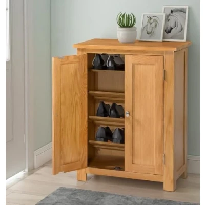 PREMIUM QUALITY SOLID OAK WOOD | Made from solid oak frame and top, with real oak veneer interior panels, this oak shoe rack offers durable storage. At W65 x H85 x D36 cm, this unit provides a clean and lasting solution for organising your footwear. SLEEK & MODERN DESIGN | Upgrade your entryway with a sleek oak shoe cabinet featuring doors and drawers for shoe storage. Finished in water-resistant lacquer with stainless steel knobs, it blends contemporary style with modern interiors. VERSATILE FUNCTIONALITY | Designed to hold up to 15 pairs of adult shoes, this shoe cabinet offers generous storage with 3 slanted shelves and 1 top flat shelf. A functional oak furniture, keeping your hallway clean, organised, and free from clutter. SUPERIOR QUALITY COMMITMENT | Featuring durable oak construction, this slim shoe cabinet offers stylish oak shoe storage in a compact design. The wooden shoe cabinet is built to last, offering reliability with a one-year quality guarantee. EASY ASSEMBLY & MAINTENANCE | Fully assembled and ready for use, this shoe storage oak cabinet requires no assembly. The hallway shoe cabinet provides lasting durability and a modern look for any entryway or hallway.