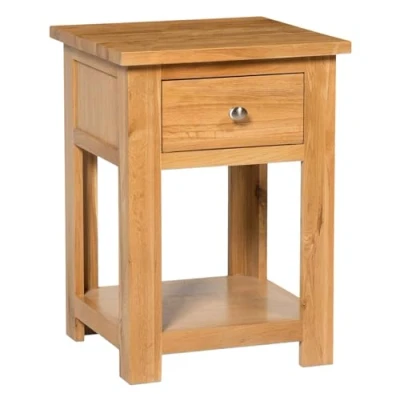 ManoManoGeneral description This solid oak lamp table stands at 59cm high, making it ideal for holding lamps in small spaces next to couches and chairs, providing optional low lighting in the evening. Crafted from solid light oak, this piece complements any room with a light or neutral theme. It is perfect for lounges, dining rooms, bedrooms, and hallways. Technical specifications Material: Solid Oak and Real Oak Veneer Finish: Lacquered Colour: Light Oak Height: 59cm Width: 43cm Length: 42cm Usage Can be used as a bedside stand for holding lamps, books, and alarm clocks. Offers additional storage space in the drawer for personal items. Can support plants, decorative pieces, or serve as a telephone stand. Features a sturdy top surface, ideal for holding lamps, books, or personal items. Other information Features a handy drawer for easy storage and quick access to personal items. Includes a shelf below the drawer for holding books, small electronics, or ornamental displays. Finished with a