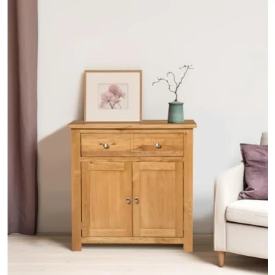 ManoManoGeneral description This light oak compact sideboard is designed to provide ample storage while enhancing your space. It features one large drawer with a double-drawer effect and a cupboard with two doors, all complemented by brushed steel knobs and a lacquered finish that protects the wood and showcases its natural beauty. This versatile piece is perfect for dining rooms, kitchens, craft rooms, or even hallways, making it an ideal storage solution for various items such as dining accessories, tablecloths, hobby supplies, crockery, and cookware. Technical specifications Material: Solid oak frame with real oak veneer in side and back panels Finish: Lacquered Colour: Light Oak Height: 80 cm Width: 80 cm Length: 38 cm Compatibility and accessories Can be paired with a Waverly Oak mirror for an enhanced look Matches other Waverly oak dining furniture Usage Ideal for storing spare bedding, beauty products, or electronics in bedrooms or hallways Sturdy top surface suitable for displaying