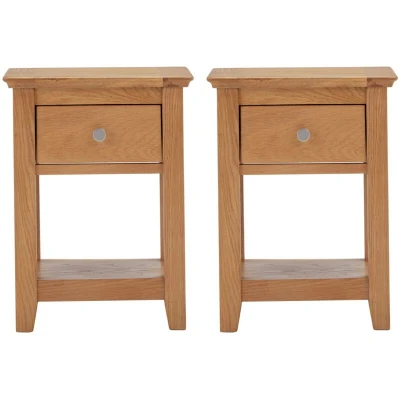 ManoManoGeneral description This set of 2 Hallowood Oak Furniture Hereford Lamp Tables is designed to fit seamlessly into any room with a light or neutral theme. Crafted from solid light oak and real oak veneer, these versatile tables are perfect for small spaces, providing functionality and style. Each table features a handy drawer for easy storage and a shelf below for additional display or storage options. Technical specifications Material: Oak, Pine, and Engineered Board Finish: Lacquered Colour: Light Oak Height: 45 cm Width: 35 cm Length: 32 cm Usage Ideal for holding lamps, books, or personal items in living rooms, bedrooms, or hallways. Can be used as a bedside stand for lamps, books, and alarm clocks. Suitable for supporting plants, decorative pieces, or as an extra surface when needed.