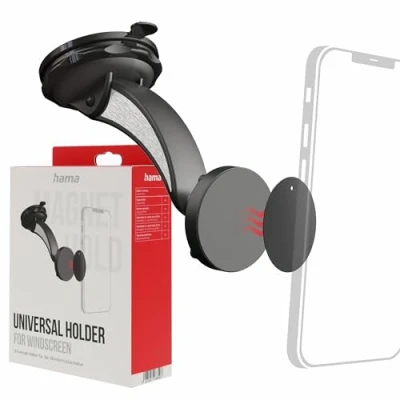 Hama Magnetic Car Phone Holder (Magnetic Holder, Suction Cup Mount, 360 Swivel, Includes 2 Metal Plates) Black