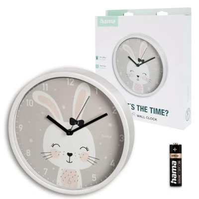 Children's wall clock without ticking sounds: clock with quiet movement thanks to the creeping second hand - no annoying ticking for a relaxed playing and learning or restful sleeping environment Quartz watch with analogue time display: with hour, minute and second hands for accurate display of the time, 25 cm diameter Child-friendly design: ideal as a wall clock for children's room, cute rabbit motif, robust plastic cover Can be used as a learning clock: clear dial with Arabic numbers for the hours and strokes for the minutes, practical for learning the watch Box contents: 1 x children's wall clock "Maui", 1 x AA Mignon battery, 1 x instruction manual (paper, cardboard and cardboard packaging of the packaging FSC-certified)
