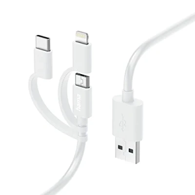 Multiple USB cable for charging and syncing smartphones, tablets, laptops. Multi-tip USB-A cable including Lightning Maximum compatibility with all Apple iPhones, iPads and iPods as well as all mobile phones, tablets and other devices with USB-C or Micro-USB port High quality fast charging cable: in combination with a fast charger, you can charge your mobile phone at maximum speed Suitable for iPhone, iPad, Samsung Galaxy, Huawei, Xiaomi, Sony Xperia, LG, HTC and more Box contents: 1 x Hama 3-in-1 multifunctional charging cable