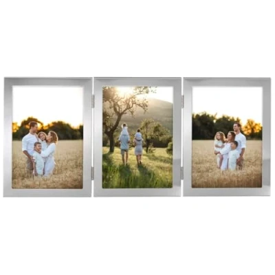 Elegant 3-piece picture frame: ideal for all photos and pictures such as family photos, baby pictures, wedding photos, portrait pictures, animal photos etc. in the format 10 x 15 cm, space for three shots Folding photo frame: high-quality aluminium frame in silver, glass type reflex, black velvet back for a particularly elegant appearance, individual frames connected with two hinges each Portrait frame for standing and hanging: whether on the wall, on the table, in the office or in the living room, the picture frame can be used standing in portrait format and hung in portrait and landscape format Photo frame collage for any motif: ideal for DIY gifts, money gifts and photos for birthdays, Christmas, Valentine's Day, wedding, birth, christening, father and Mother's Day, anniversary, grandma, grandpa, godparents, etc. Box contents: 1 x portrait frame "Calais" (36 cm x 16.9 cm x 1.1)