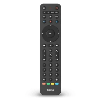 The Hama 00221055 universal remote control allows you to control up to eight devices, including televisions, set-top boxes, satellite receivers, soundbars, terrestrial receivers, cable television receivers, Blu-ray players, and amplifiers. @@@Y5XGy/2fLGLVdMLSzqEG7E/3wyW6t/C3@@@ is pre-programmed for over 1,000 devices, including brands such as Samsung, LG, Philips, Panasonic, Sony, and Grundig. With its streaming buttons, quickly access your favorite services like Netflix, Disney+, and Amazon Prime. The learning function allows you to easily transfer functions from your original remote to this universal remote, preserving all important features. The remote comes with 2 AAA alkaline batteries, a code list, and a user manual. It measures 20.2 cm in length, 4.7 cm in width, and 2.1 cm in height, with a weight of 227.95 grams. The maximum range is 10 meters. The remote is black, features a standard size, and has 43 buttons. It is guaranteed for 2 years. The package dimensions are 25.7 cm in height, 7.7 cm in width, and 4.3