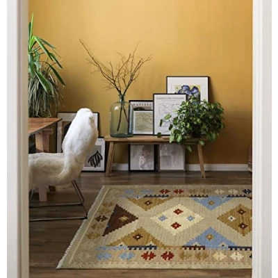 ✅ [ HANDMADE COMPOSITION ]: High quality and beautiful kilim, carefully knotted by hand, durable and easy to care for. 100% wool. Height/thickness: 5 mm. Warm colors to bring color to your decor ✅ [ VARIED DESIGNS ]: Geometric design rugs combined with characteristic earth colors very vivid and natural, designed to fit any home decor. They are easy to combine with other home textiles. They bring personality, warmth and style to any space decor ✅ [ PROTECT FLOOR AND DECORATE ]: Versatile rugs for bedrooms, living rooms, hallways and living rooms. It serves both to protect the floor and to decorate different areas of the house giving it a colorful touch ✅ [ DURABLE AND EASY INSTALLATION ]: Very durable carpet with a soft feel. Special for high traffic areas. Simply unfold and lay the rug to your liking. No marks left when bending or unfolding due to the high quality ✅ [ WASHING INSTRUCTIONS ]: Can be cleaned with a vacuum cleaner. Do not wash in the washing machine and do not use stain remover or any other chemicals. For specific stains, wipe with a damp cloth