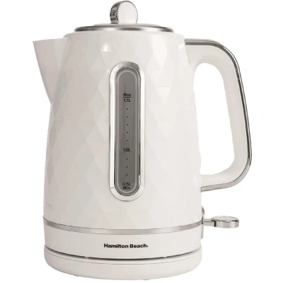 General description Transform your kitchen with the Hamilton Beach Diamond Electric Kettle, a perfect blend of style and functionality. With a generous 1.7L capacity, it boils up to 7 cups of water at once—ideal for family gatherings, tea parties, or hosting friends. The kettle's sleek diamond-textured body, complemented by chrome accents, adds a touch of modern elegance to any countertop. Equipped with boil-dry safety protection and an on/off indicator light, it ensures peace of mind with every use. The easy-to-read water window lets you effortlessly check the water level, while built-in cord storage keeps your kitchen neat and tidy. Technical specifications Capacity: 1.7L (boils up to 7 cups) Dimensions: Height - 25.9cm, Width - 21.5cm, Length - 15.7cm Weight: 1.2kg Other information Boil-Dry Safety Protection with On/Off Indicator Light Easy-to-Read Water Window Built-In Cord Storage