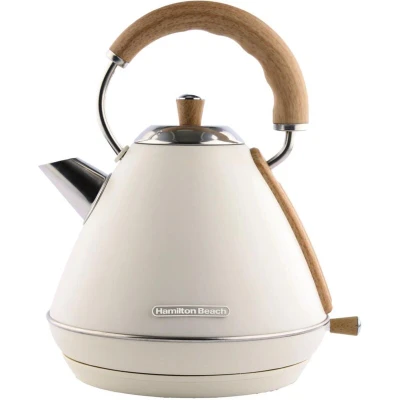Hamilton Beach Electric Kettle, Scandi 1.7L, Pyramid, Boil Dry Protection, Auto Shut Off, Water Level Window, Stay Cool Handle, Ergonomic Grip, Matte Cream with Wood Effect HBK02MC