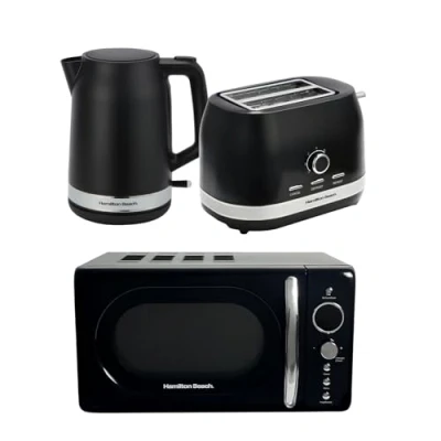 ManoManoGeneral description The Hamilton Beach Ella Black Kitchen Bundle includes a 1.7L Kettle, a 2 Slice Toaster, and a 20L Black Retro Microwave. This stylish and functional set is perfect for family households, adding a modern touch to any kitchen. Technical specifications Kettle capacity: 1.7L Microwave capacity: 20L Microwave power: 700W Toaster power: 800W Toaster browning levels: 7 variable settings Installation Easy to set up with no complicated installation required. Usage The kettle features boil dry protection, automatic switch-off, and a detachable filter for easy cleaning. The toaster includes convenient defrost, cancel, and reheat settings. The microwave is equipped with 8 pre-set programmes for precise cooking control. Manual control panel for easy adjustment of timer and power settings. Other information The kettle has an ergonomic lift-and-grip handle and a water level window for convenience. The toaster has a removable crumb tray and integrated cord storage for easy