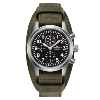 Rugged, resilient and precise, the Khaki Field Automatic Chronograph is the perfect timepiece for confident explorers. This Chronograph watch is equipped with a Stop Watch, Screw Down Crown and has a Swiss Made movement Premium Green Leather strap, measuring 21 cm in length and 22 mm in width, with a Sapphire glass. Case diameter: 44 mm,case thickness: 14 mm, case colour: Silver and dial colour: Black Water resistant: 10 bars-Weight: 135 g The watch is delivered in an original gift box and has a warranty of 2 years