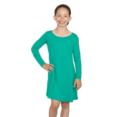Hamishkane® Girls Summer Dress Plain Long Sleeve Round Neck Flared Mini Swing Stylish for All Occasions Jade Green