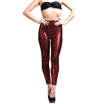 Hamishkane New Ladies Mermaid Fish Scale Print Slim Fit Shiny Disco Metallic Leggings Pants Red