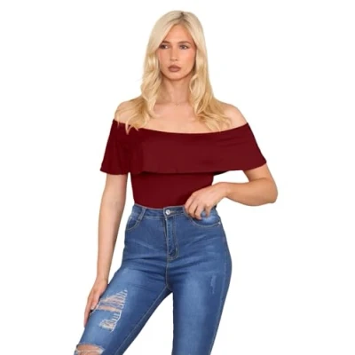 Hamishkane New Ladies Plain Off The Shoulder Ruffle Frill Bardot Bodysuit Stretch Leotard Top Wine