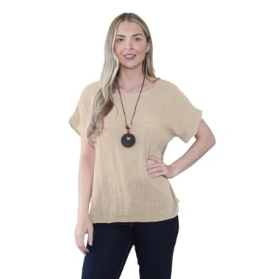 Hamishkane® Women Italian Short Sleeve Cotton T Shirt Top with Necklace Sophisticated Women's Summer Tops UK Breathable Tunic for Stone