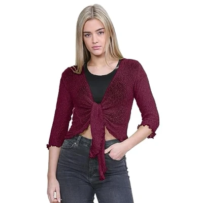 Chic & Versatile: This tie front crop top is a stylish, functional piece that doubles as a bolero shrug for women. The three-quarter sleeve tops provide a flattering silhouette, perfect for pairing with shrugs for evening dresses or wearing as a sleek bolero cardigan for casual or formal events Comfortable & Stretchy: This women's cropped cardigan ensures a soft and flexible fit, making it the perfect lightweight shrug for day-to-day wear. Available in onesize, this womens shrug provides both comfort and style in a cropped cardigan women design Long Lasting Fabric: This shrug cardigan is made with a plain weave that guarantees durability. It’s designed to retain its shape and color after frequent washes, ensuring your bolero for women stays the same. Plus, it’s machine washable for easy care, making it a convenient piece to add to your rotation of ladies boleros and shrugs Gorgeous Colors: From vibrant shades to timeless classics, this summer cardigan comes in a variety of colors, including the ever-popular black bolero for women and a white cardigan women. You’ll find a perfect hue that fits your personal style, whether for a bold look or a more subtle cropped black cardigan style All-Season Essential: The tie front cardigan offers a lightweight and breathable option for summer, while also serving as an easy layering piece over dresses or tops in cooler weather. Ideal for weddings or evening events, this bolero shrug for women can be worn as a sophisticated evening cardigan. It’s a versatile cropped cardigan perfect for all seasons