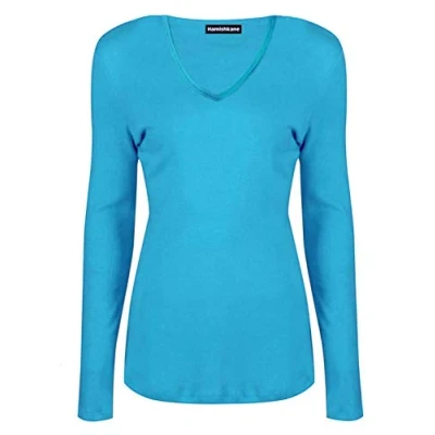 Hamishkne Ladies Long Sleeve V Neck T Shirt Stretchy Slim Fit Plain Jersey Basic Casual Top Turquoise