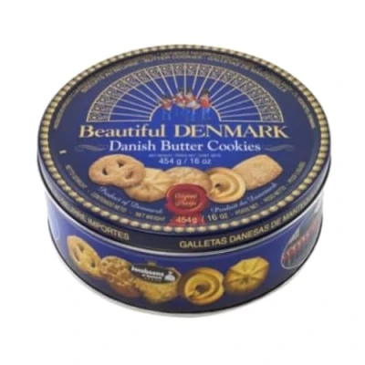 454g tin of melt in the mouth Danish butter cookies Blue traditional design tin The biscuits are made in Denmark by Hamlet Tin is approximately 19cm x 19cm x 6cm in size