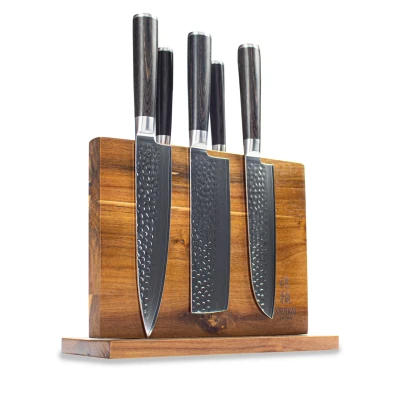 Take advantage of this razor-sharp combination deal and benefit from a large discount! This combi deal contains a 5-piece knife set from the Hammered Damast BR-Series + a magnetic knife block that is magnetic on both sides. This combination is a real eye-catcher in the kitchen and ensures that your new favorite knives are stored in a stylish way. This acacia wood knife block comes with 5 knives from the Hammered Damast BR series that are suitable for various cutting tasks in the kitchen. The combination of pakka wood handles and an acacia wood knife block will make the knives come into their own. The set consists of: 1x Hammered Damast BR-Series - 5-piece knife set 67 layers of VG-10 damask steel Hardened to 61 HRC Rockwell 1x Magnetic knife block acacia wood double sided Durable and strong Firm Practical and elegant The prices mentioned include a €40 discount. Hammered Damask BR-Series from Shinrai are unique for every kitchen. This edition of the Hammered Damast BR-Series is finished to perfection. The hand-hammered damask steel blade continues into a beautiful pakka wood handle. The blade is hammered by hand. This technique is called tsuchime. This not only ensures high sharpness and a beautiful appearance, but also prevents your cuttings from sticking to the blade. Complete knife set that you can enjoy for at least 30 years. 67 layers of VG-10 damask steel Hardened to 61 HRC Rockwell Razor-sharp 5-piece knife set Comes in a luxury gift box The best in its price range ComfortableAll blades are extremely sharp. Due to the perfect balance, they lie comfortably in your hand. Cutting food has never been so easy and fun! Handmade in detailBecause the knives are handmade, attention has been paid to every detail during production. This way you get the best quality knives. Perfect gripThe hand-hammered damask steel blade continues into a beautiful pakka wood handle. The blade is hammered by hand in style. The handle is very comfortable to hold, both for left and right-handers. A beautiful detail is the Shinrai logo on the end of the handle. A beautiful knife with the perfect grip. A beautiful giftThe knives are always delivered in a beautiful gift box. This not only ensures that the blades are protected on the go, but also that it puts a smile on your face when you receive it. VG10 67 layers damask steel Shinrai knives are unique as most of them are handmade. Both sides of the knife consist of 33 layers of the best steel. These layers are placed against a layer of VG10 steel, giving you a knife of 67 layers. This is also called Damask steel. The production technique is centuries old and results in stronger and harder knives. This makes the knives indispensable for every kitchen. Buy the entire knife set today and benefit from an extra discount and free shipping!