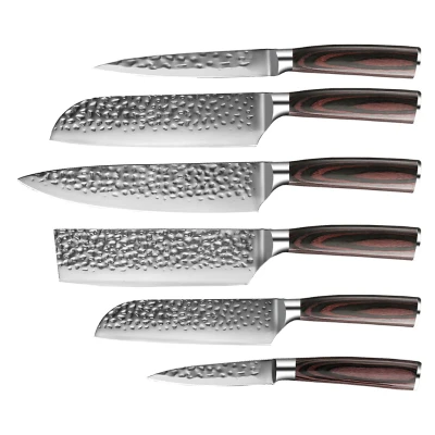Shinrai KnivesHammered Stainless Steel Series by Shinrai is unique in any kitchen. This edition of the Hammered Stainless-Steel Series is finished to perfection. The hand-hammered steel blade continues in a beautiful pakka wood handle. The blade is hammered by hand. This technique is called tsuchime. This not only ensures a high sharpness and a beautiful appearance, but also prevents your cuttings from sticking to the blade. Made of hammered stainless steel Hardened to 59 HRC Rockwell Razor sharp 6-piece knife set Comes in a luxury gift box Best in its price range People who cut a lot probably suffer from it. Knives that become blunt very quickly and blades where the cut food always sticks to the knife. With this razor-sharp knife set from Shinrai, that is a thing of the past Pleasurable in every wayAll knives are extremely sharp and perfectly balanced, making them comfortable to hold. Cutting your food has never been more fun. Handmade to the last detailAs the knives are handmade, each and every detail has been checked and taken into account. Providing you the best quality in knives. Perfect gripThe handle consists of high quality Pakka Wood. This is a type of hard wood with a characteristic dark texture, creating a perfect grip. A gift to giveThe knives are delivered in a premium gift box, ensuring protected and low-risk shipment. The perfectly wrapped gift for everyone who enjoys cooking. Specifications Series Hammered Stainless Steel Length blade 20cm (chef) | 18cm (Nakiri) | 18cm (santoku) | 13cm (santoku) | 12cm (utility) | 8cm (paring) Blade High Carbon Steel Weight 232g (chef) | 237g (Nakiri) | 210g (santoku) | 153g (santoku) | 123g (utility) | 98g (paring) Handle Pakka Wood Package Premium Giftbox Right/Left handed Symmetric Grinding method Asian Cut We strongly advise to handwash the knives to preserve the blade and wooden handle.
