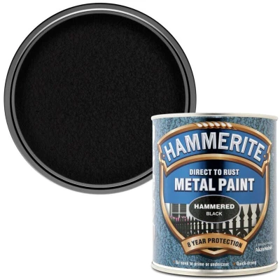 General description This Hammerite Direct To Rust Metal Paint is a high-quality, durable metal paint designed for both indoor and outdoor use. It provides long-lasting protection against rust and corrosion, forming a tough barrier that repels moisture and shields metal surfaces from environmental damage. The paint features a decorative hammered finish that adds an attractive metallic sheen to the surface and can be applied directly onto rusty metal without the need for a primer or undercoat, making the painting process faster and easier. Technical specifications Finish: Hammered Color: Black Container Size: 750ml Coverage: Approximately 3.75 m² per container Drying Time: Touch dry in 1 hour; recoat after 4 hours Durability: Provides up to 8 years of protection Compatibility and accessories Suitable for ferrous and non-ferrous metals, including gates, railings, drainpipes, guttering, and garden furniture Can be applied directly onto rusted surfaces after cleaning Application tools: