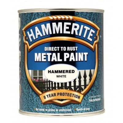 General description Hammerite Direct to Rust Hammered Finish Metal Paint is a durable, corrosion-resistant decorative coating designed for application directly onto rusty or clean metal surfaces without the need for primer or undercoat. This paint features a subtle hammered appearance with a metallic sheen, providing long-lasting protection against corrosion for both indoor and outdoor use. Technical specifications Finish: Hammered Color: White Size: 750ml Coverage: 5 sq m per litre Durability: Up to 8 years of protection Drying Time: Touch dry in 1 hour; recoat in 4 hours Compatibility and accessories Suitable for use on rusty and clean metal surfaces Can be applied directly onto existing rust or painted metal Compatible with brushes, rollers, and spray equipment Installation Ensure the surface is clean, dry, and free from loose rust, dirt, or grease Apply the paint directly onto the prepared surface using your preferred method (brush, roller, or spray) Allow to dry for at least 1