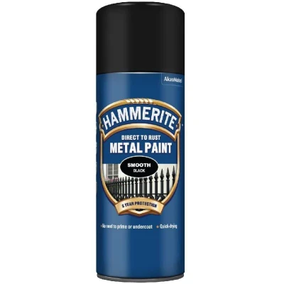 General description Hammerite Direct to Rust Smooth Finish Aerosol in Black is a versatile metal paint designed for direct application on rusty surfaces. Its unique 3 in 1 formula eliminates the need for a primer or undercoat, saving you time while providing a smooth, glossy finish. This paint not only seals out moisture but also offers long-lasting protection for both indoor and outdoor metal surfaces. Technical specifications Finish: Smooth Colour: Black Size: 400ml aerosol Coverage: Up to 0.5m² Touch dry in 1 hour Repaintable after 15 minutes Usage Hammerite Direct to Rust Metal Paint Aerosol is suitable for a variety of exterior metal applications, including: Metal doors Metal garden furniture Metal gates Metal railings Other information This product protects surfaces for up to 5 years and is corrosion resistant, making it ideal for outdoor use.