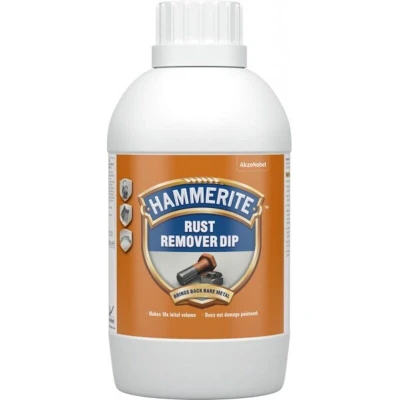 General description Hammerite Rust Remover is specially developed for the safe and effective removal of rust from metal items. It is ideal for car parts, nuts, bolts, and garden tools. The gentle formula is non-harmful, safe to the skin, and will not damage paintwork. Simply immerse rusty items into the dip, and in a couple of hours, they will be rust-free. Technical specifications Volume: 500 ml Dilution: Makes 10 times its initial volume Rust removal time: 2-3 hours Usage Exterior and interior usage Easy to use